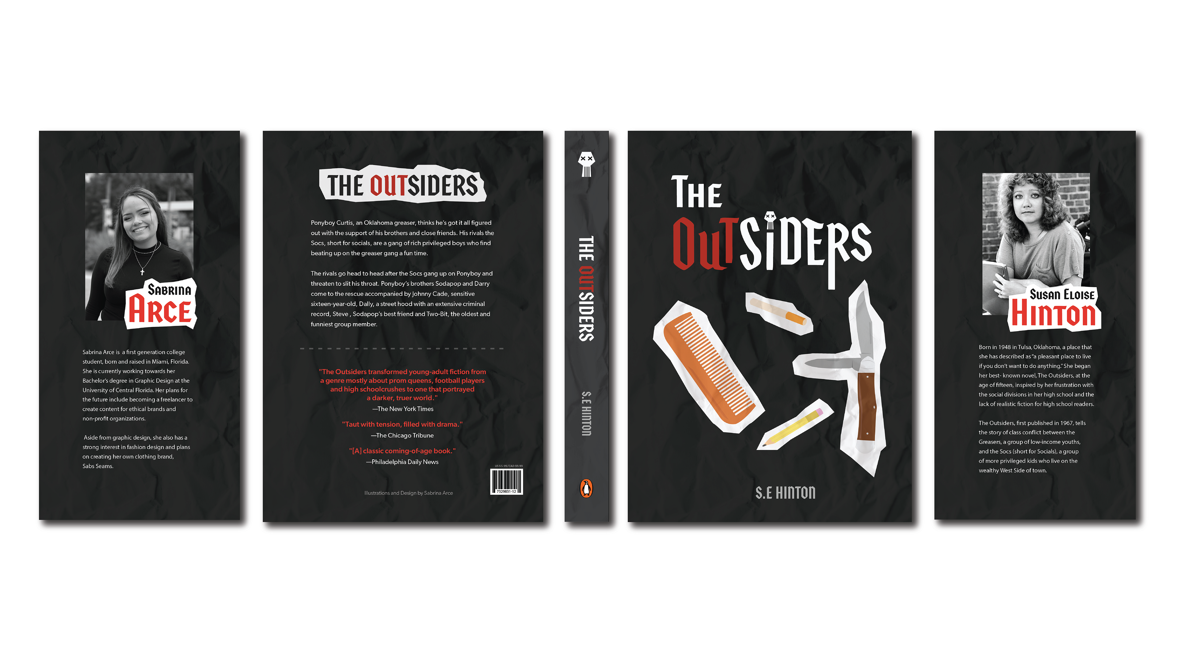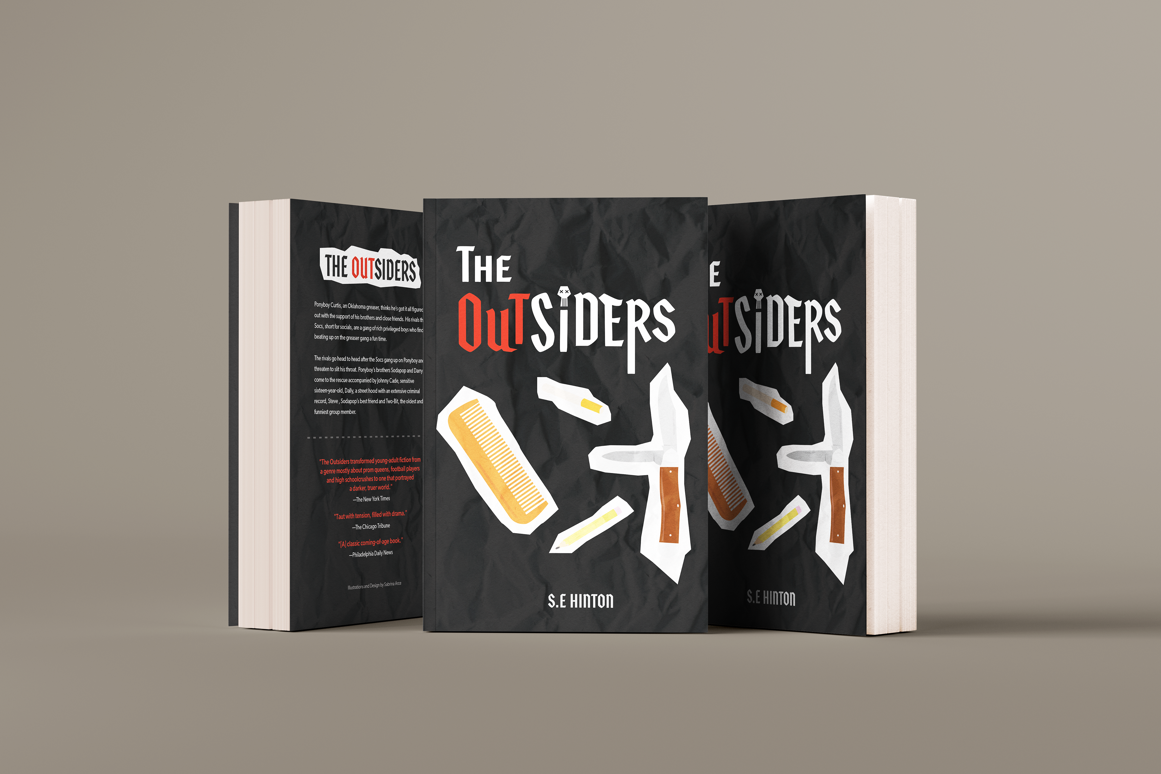 For this project, I gave the famous novel, The Outsiders, a brand new book cover. As the book deals with rival gangs of young boys, I included some of the daily essentials of these boys, on the cover.